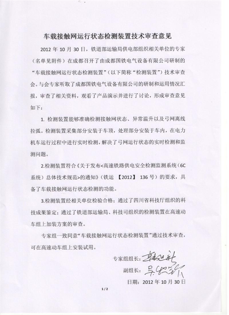 2012年10月30日铁道部在蓉召开关于车载接触网运行的状态检测装置技术审查会